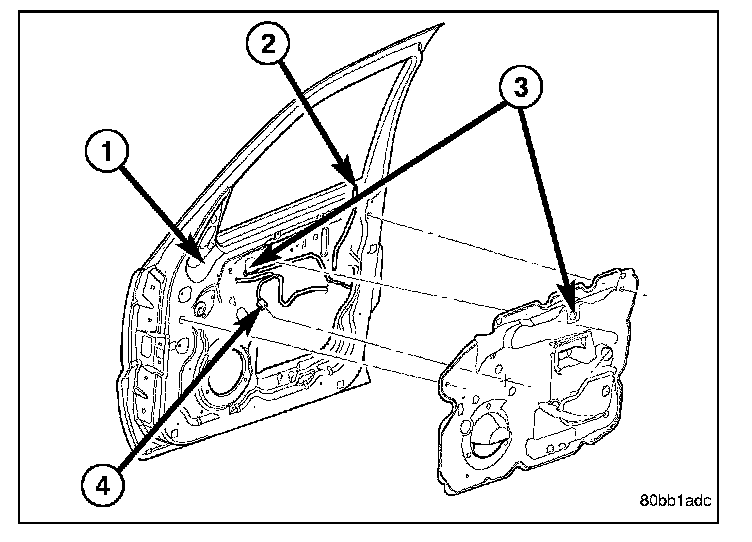 3. Disconnect the glass from the regulator lift plate (3) and re-install the clips (1).