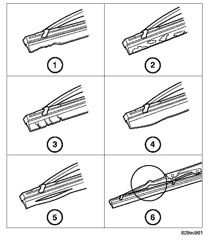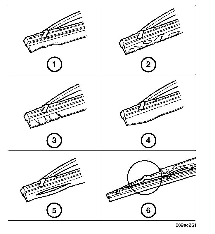 1. Carefully inspect the wiper blade for any indications of worn or uneven edges (1), foreign material deposits (2), hardening or cracking (3), deformation or fatigue (4), or splitting (5). Inspect the wiper blade support components and the wiper arm for damage (6). If the wiper arms and blades are contaminated with any foreign material, clean them and the glass as required. If a wiper blade or arm is damaged, replace the affected wiper blade or arm with a new unit. Do not attempt to repair a wiper arm or blade that is damaged or corroded.