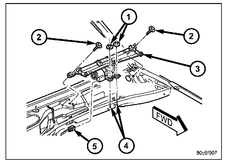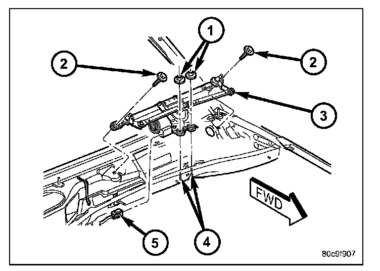 7. Remove the two nuts (1) that secure the front wiper module to the two weld studs (4) on the bottom of the cowl plenum panel.
