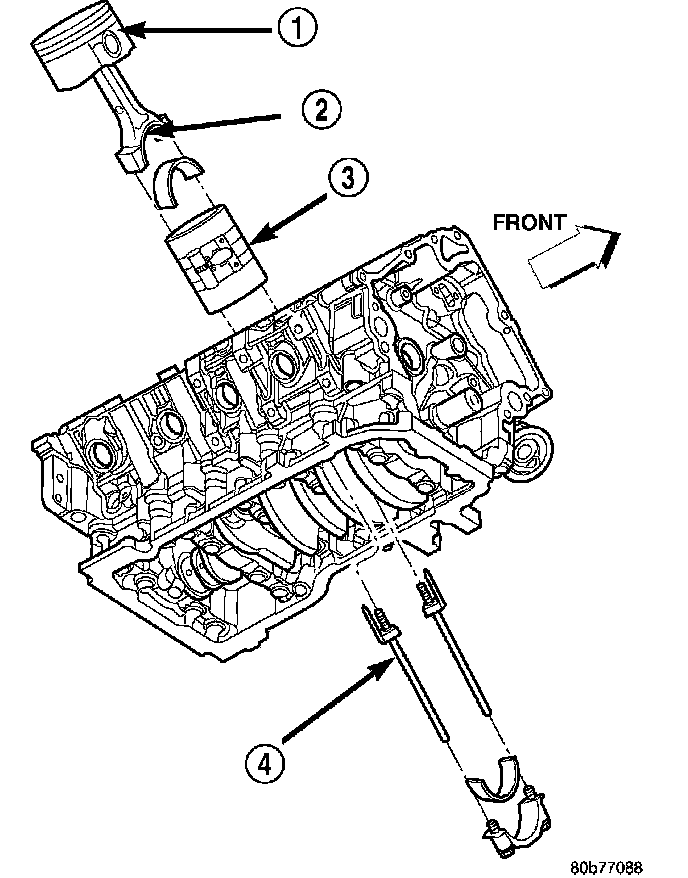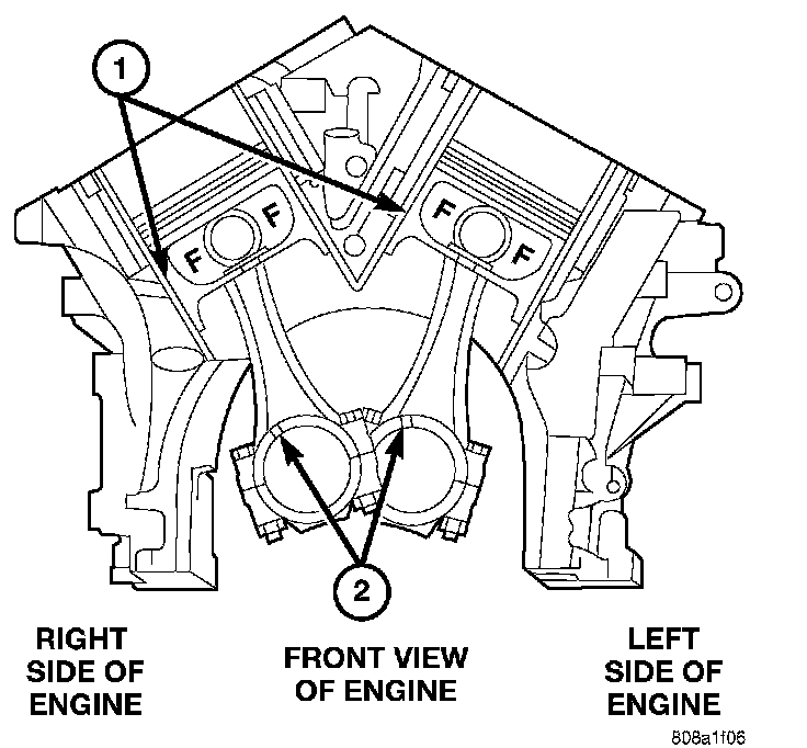 6. The pistons are marked on the piston pin bore surface with an raised F indicating installation position. This mark must be pointing toward the front of engine on both cylinder banks. The connecting rod oil slinger slot (2) faces the front of the engine.