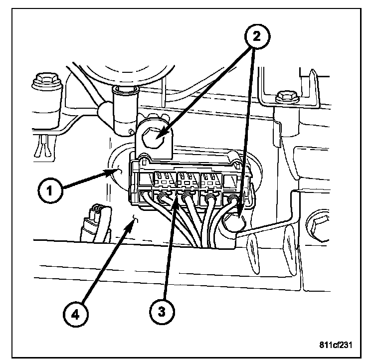 1. Position the blower motor resistor (1) into the HVAC housing (4).