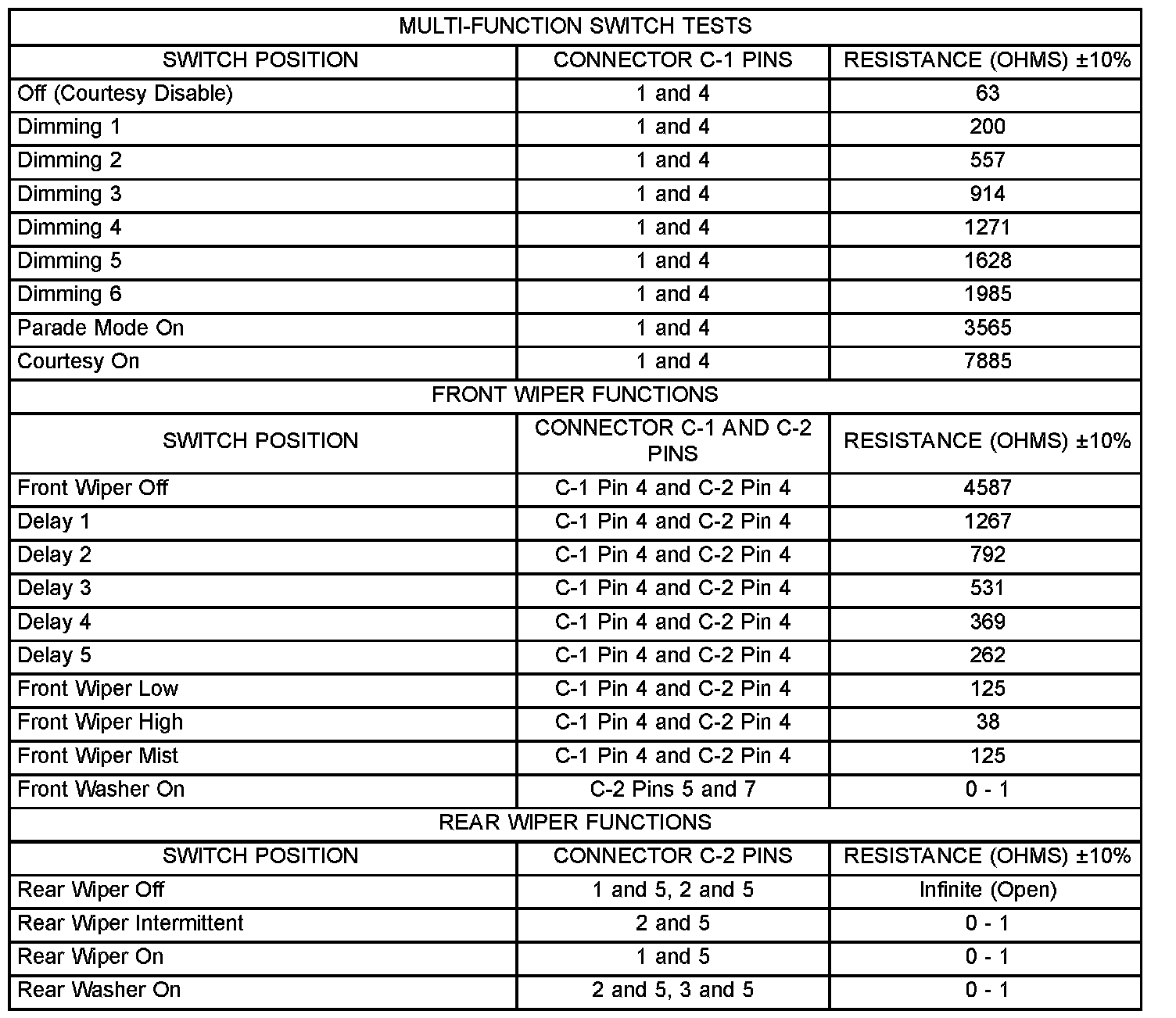 3. Using an ohmmeter, perform the continuity and resistance tests at the terminals in the multi-function switch connector as shown in the Multi-Function Switch Tests table.