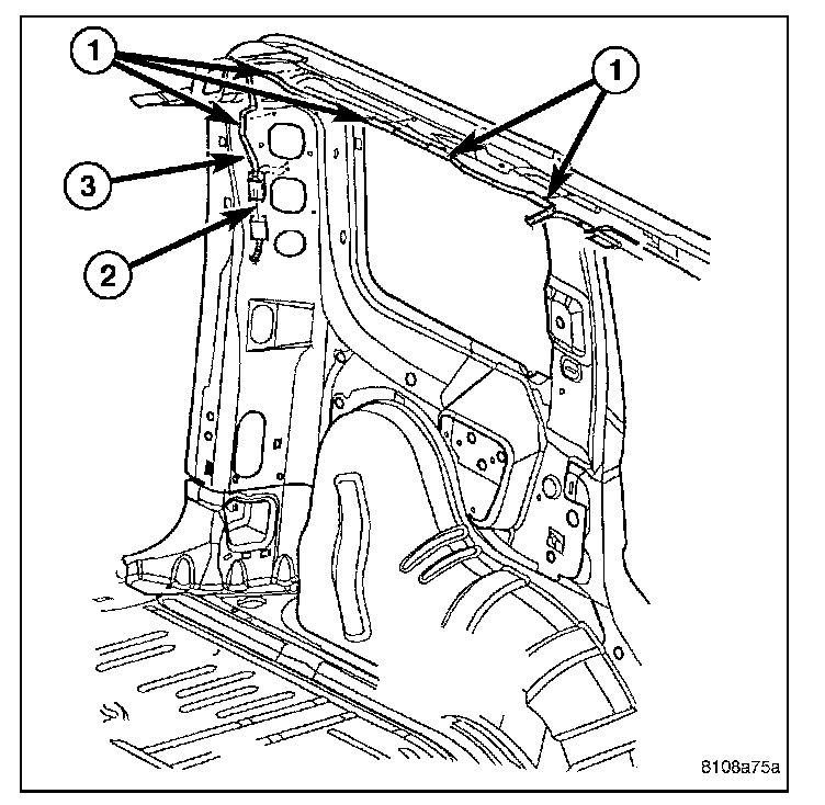 6. Disconnect wire harness push in fasteners (1) and electrical connector (2) from vehicle harness (3).