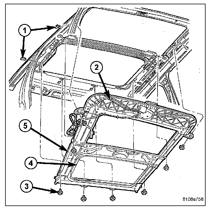 5. Raise rear end of sunroof module assembly and guide into position and start fasteners.