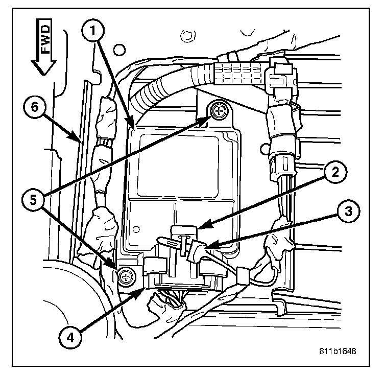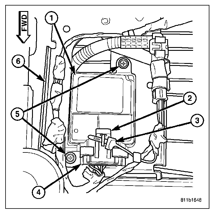1. Carefully position the Occupant Classification Module (OCM) (1) to the OCM bracket (6) that is welded onto the underside of the passenger side front seat cushion frame. When the OCM is correctly positioned, the connector receptacle on the module will be pointed forward in the vehicle.