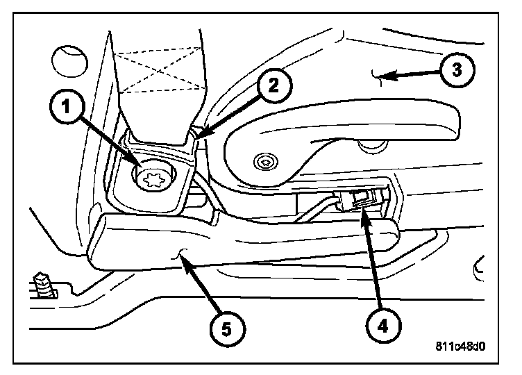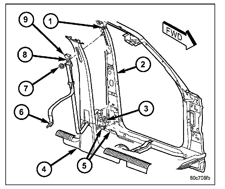 1. Adjust the front seat to its most forward position for easiest access to the front seat belt lower anchor (2) and the B-pillar trim.