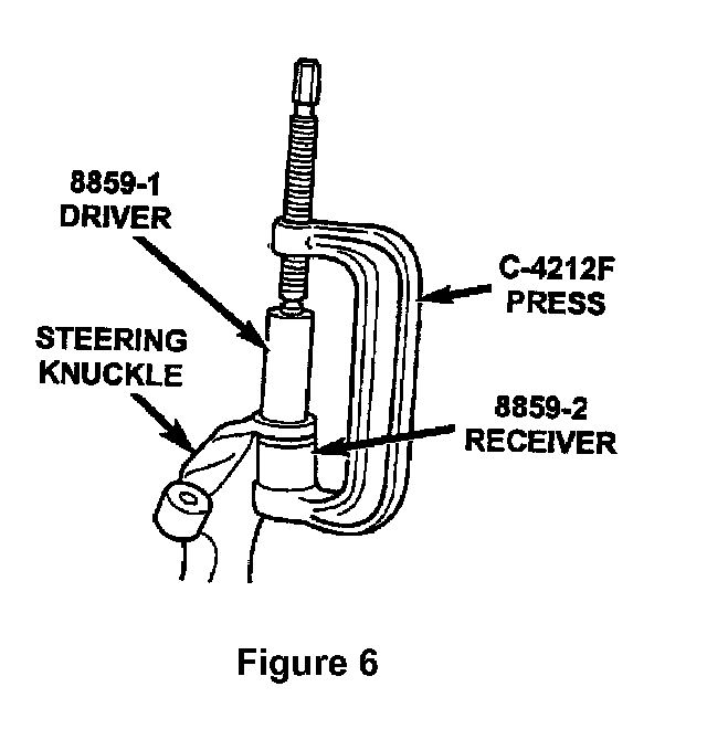 17. Press the lower ball joint from the steering knuckle using special tool C-4212F (press), 8859-2 (receiver) and 8859-1 (driver) (Figure 6).