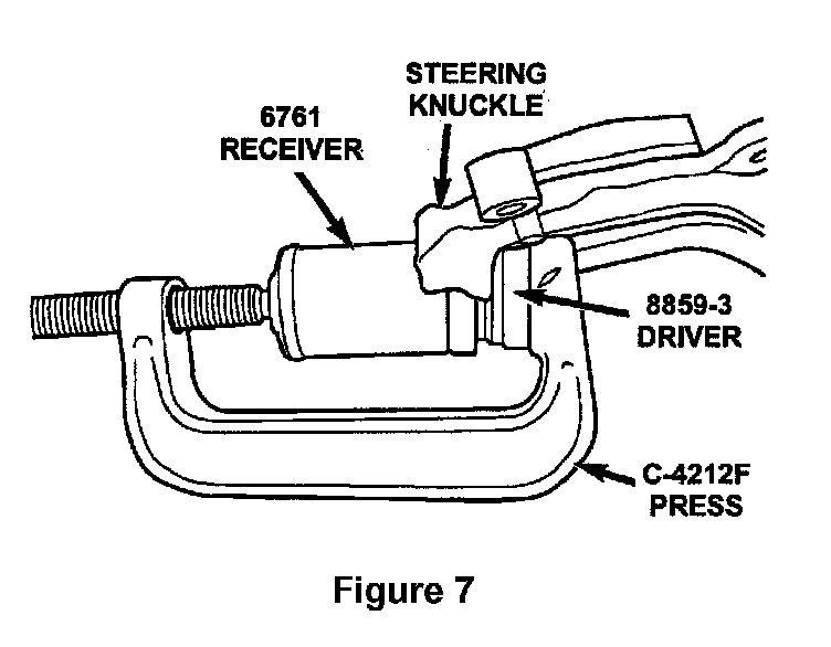 19. Install the new ball joint into the steering knuckle and press into position using special tools C-4212-F (press), 8859-3 (driver) and 6761 (receiver) (Figure 7).