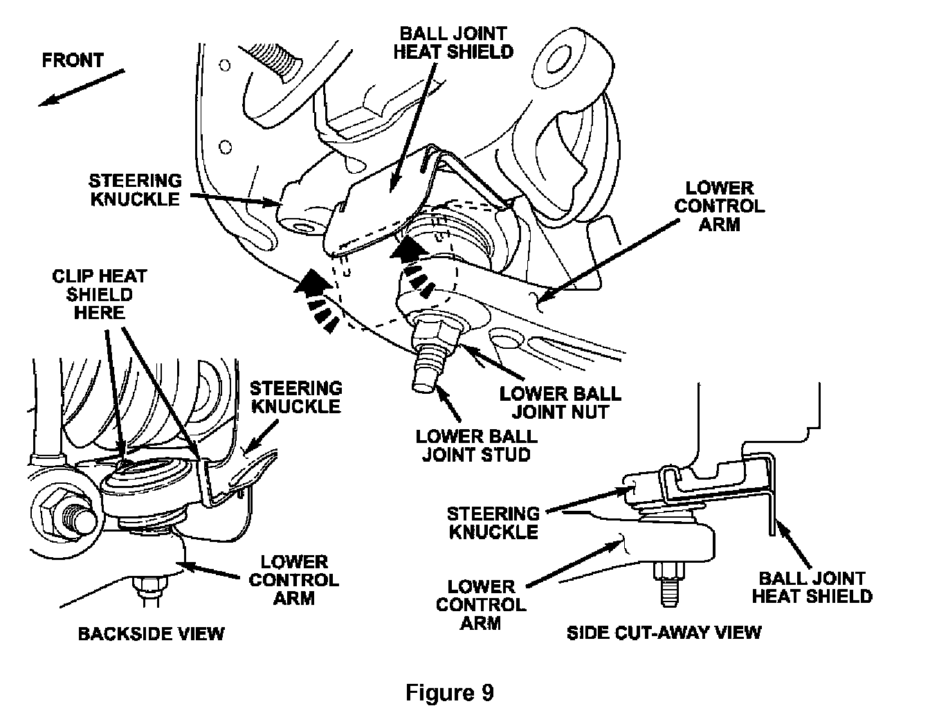 31. On 2002 and 2003 model year vehicles, inspect the steering knuckle for the presence of a ball joint heat shield. Vehicles without heat shields must have them installed (Figure 9).