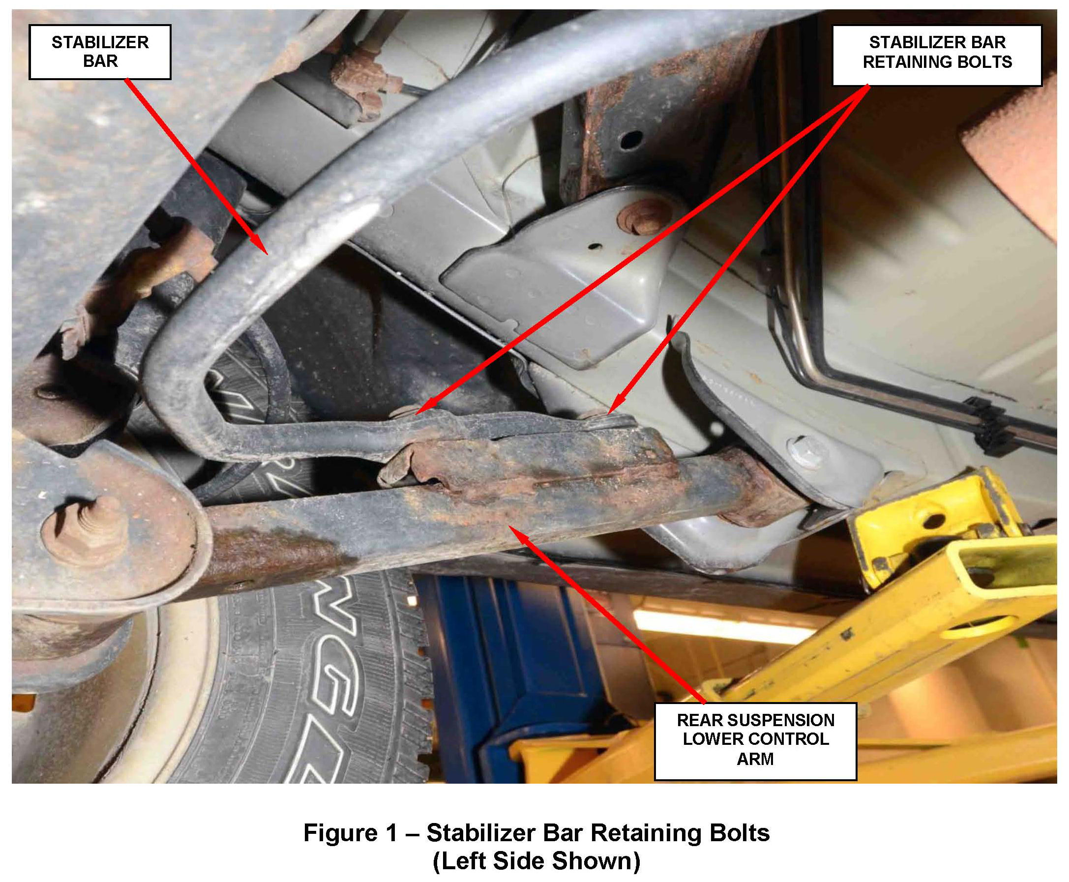 1. Raise the vehicle on a hoist and support the rear axle with a jack.2. Remove and discard the right and left side stabilizer bar retaining bolts from the rear suspension lower control arms (Figure 1).