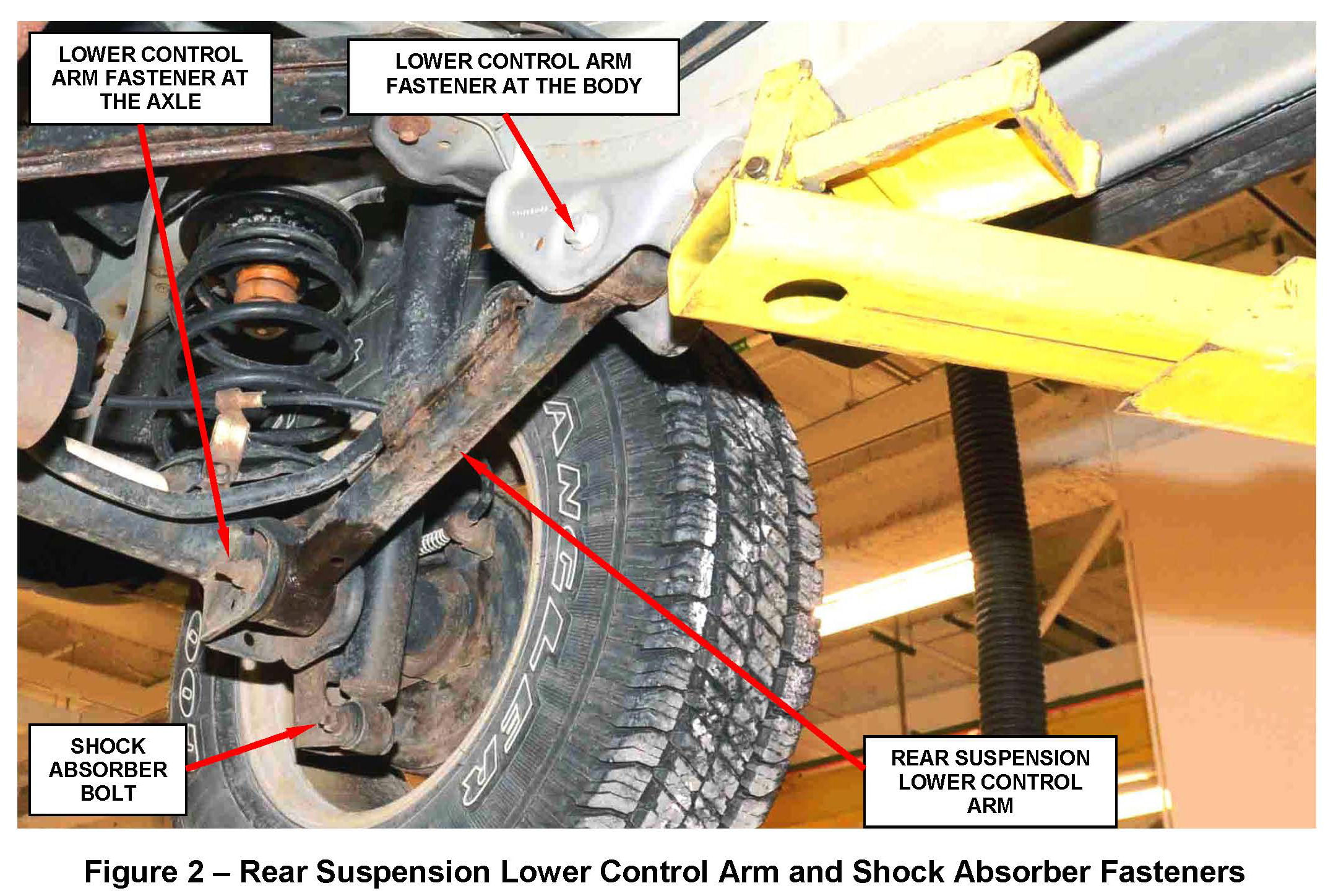 5. Remove and save the left side rear suspension lower control arm fastener at the axle (Figure 2).