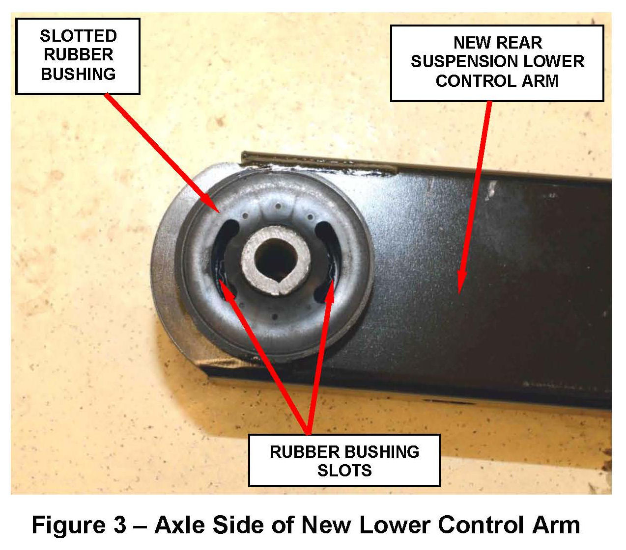 15. Install the new right side rear suspension lower control arm into position. Be sure that the slotted rubber bushing on the lower control arm is closest to the rear axle (Figure 3).