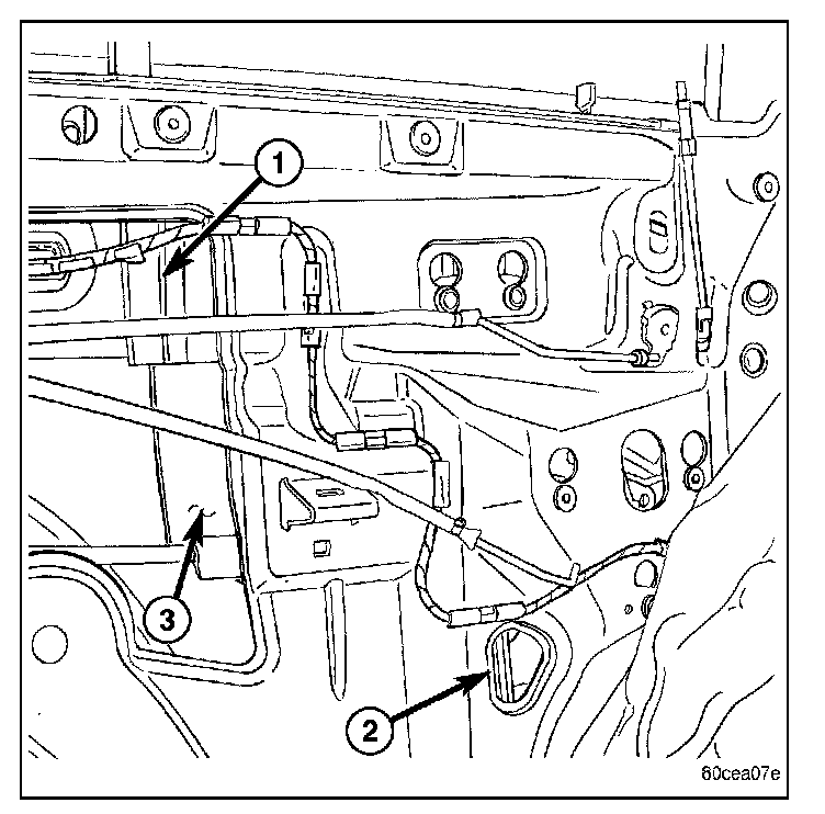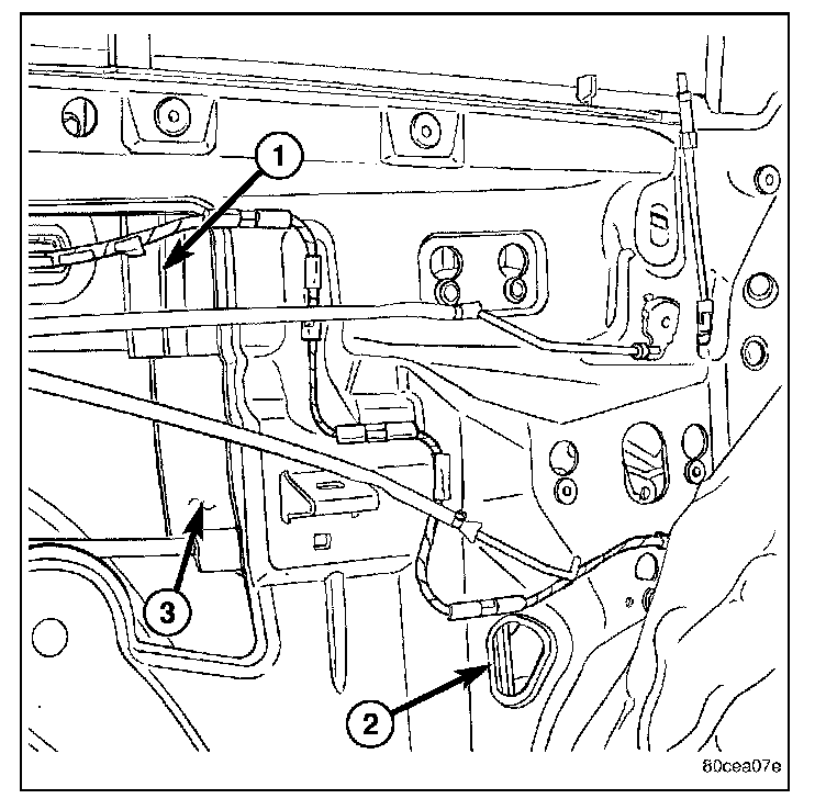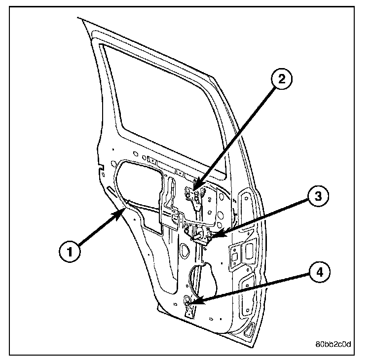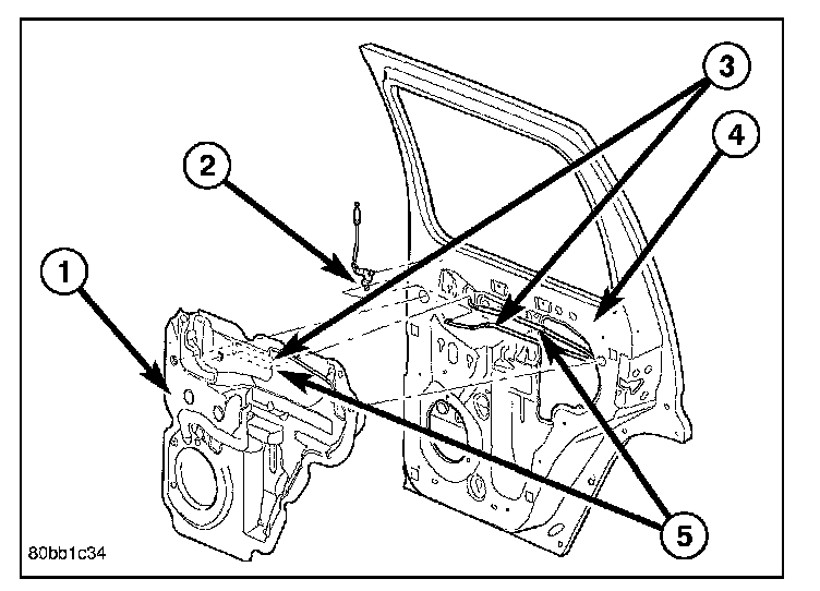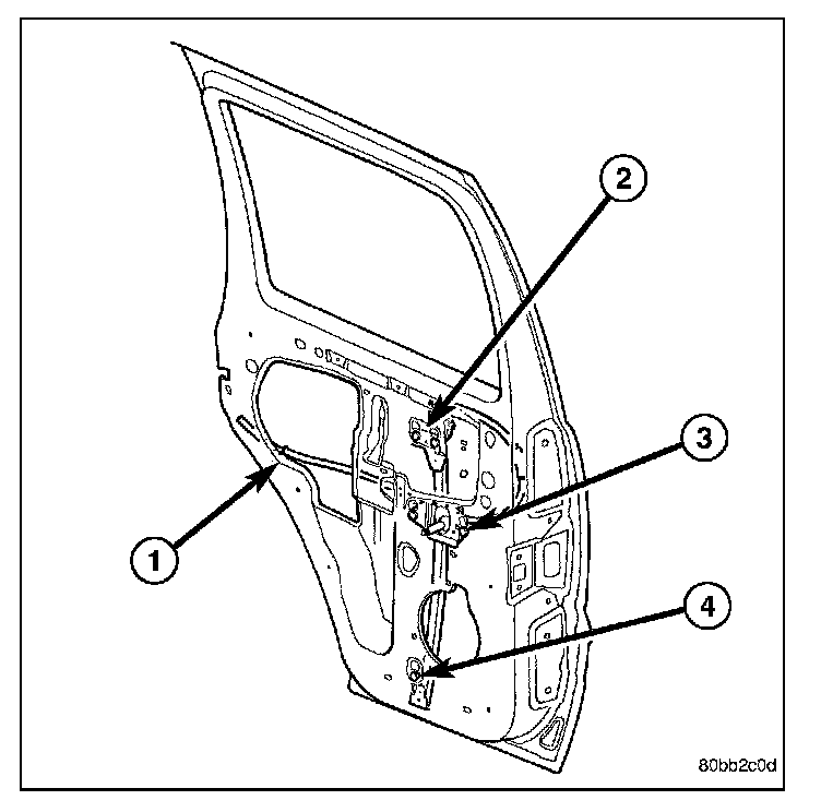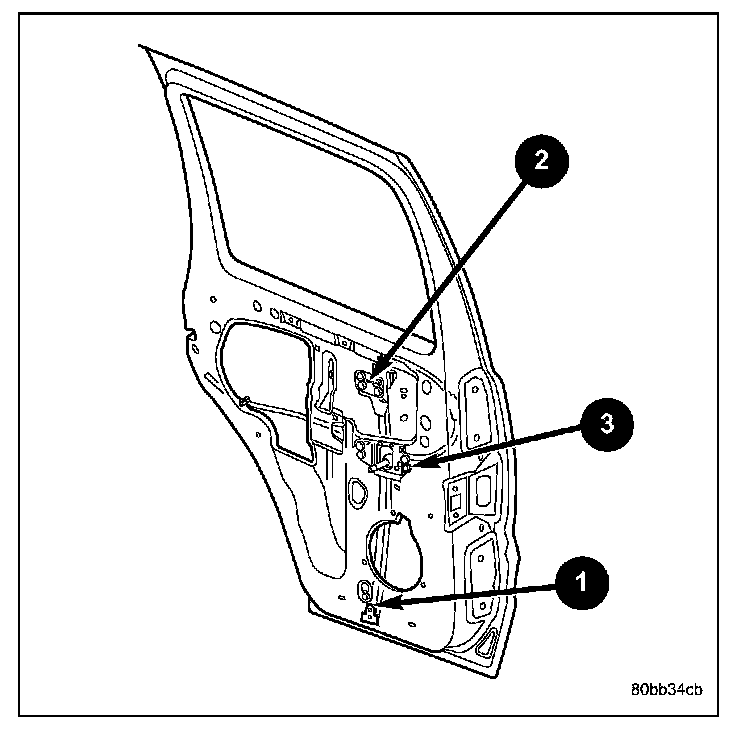 2. Raise the glass (3) and line up the lift plate clip with the hole (2) in the door panel shown.