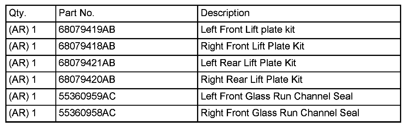 Some 2006 MY or 2007 MY Jeep Liberties may have an alternate window regulator installed with a different glass attachment. They may be marked with a sticker on the inner door to identify this change. These regulators require the "pin on glass" attachment style service kit (2002-2005 MY type).