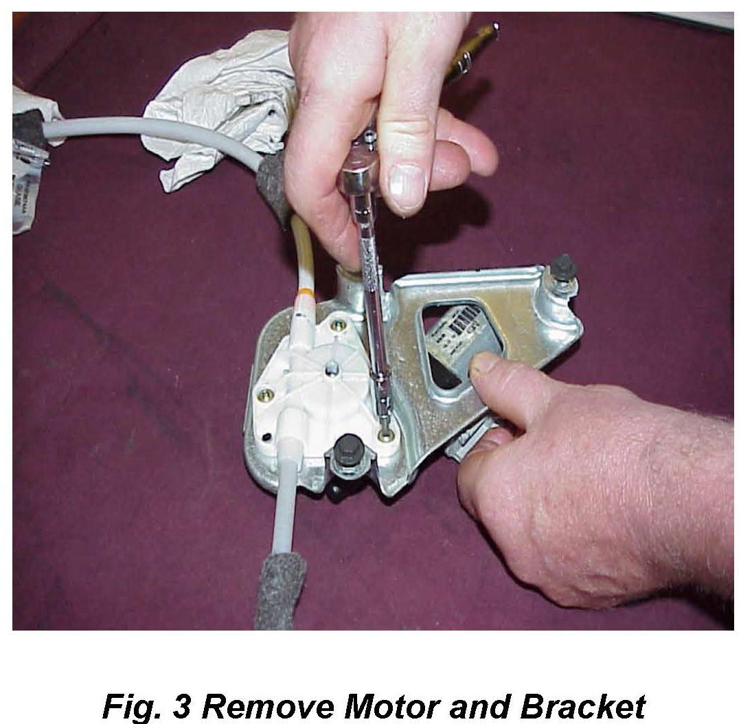 13. Install the motor and mounting bracket back onto the window regulator. Align the drum housing pilots with the motor bracket and motor (Fig 3).