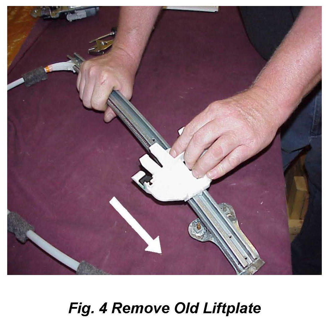 8. Remove the original lift plate and cable from the regulator and discard (Fig 4).