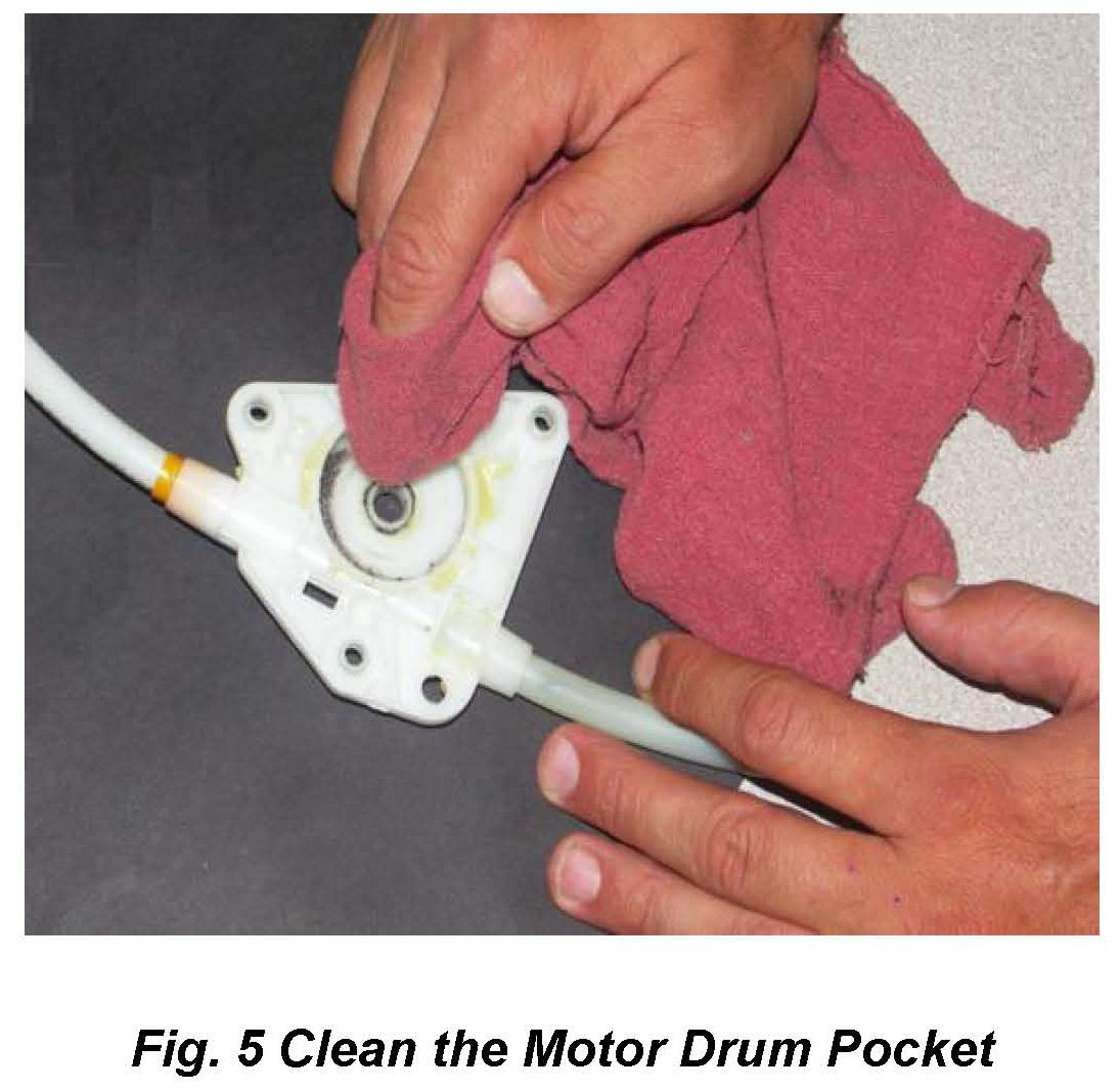 9. Clean the old grease, chips and debris in the Motor Drum Pocket and in the Rail cable groove with a shop rag (Fig 5).
