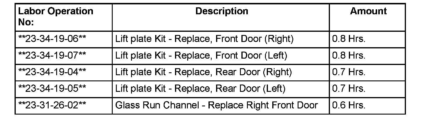 3. Following the procedures in DealerCONNECT > TechCONNECT under: Service Info > 23 - Body > Door > Regulator, Window, remove the window regulator from the affected door(s).