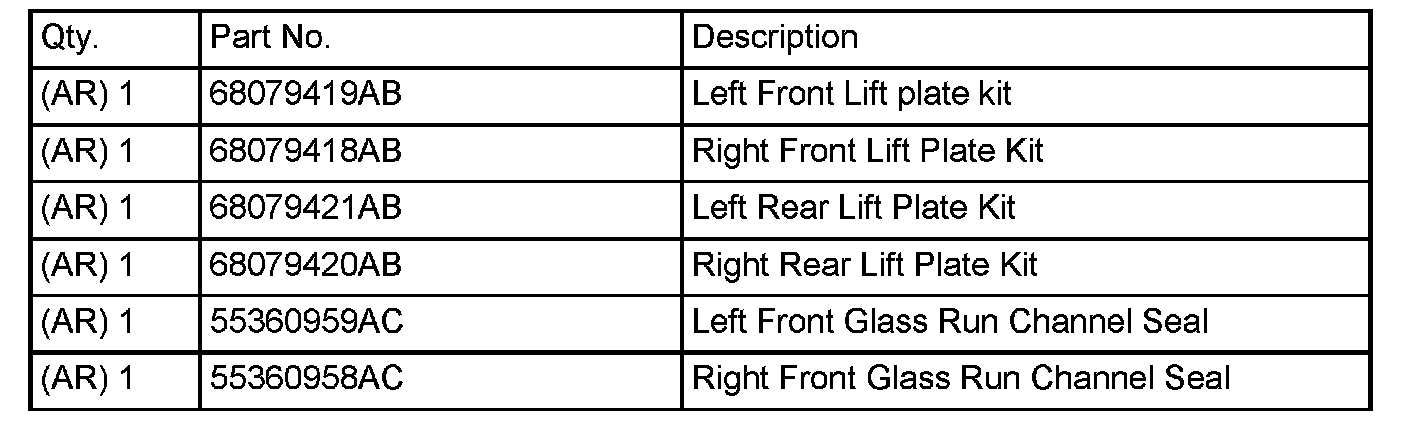 Some 2006 MY or 2007 MY Jeep Liberties may have an alternate window regulator installed with a different glass attachment. They may be marked with a sticker on the inner door to identify this change. These regulators require the "pin on glass" attachment style service kit (2002-2005 MY type).