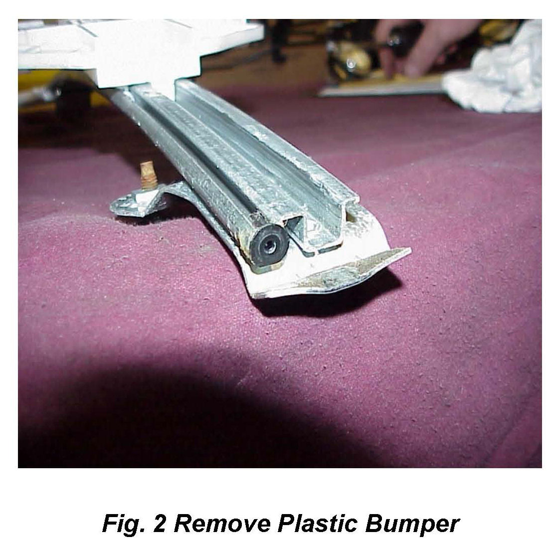6. Remove and save the small black plastic bumper located in the end of the rail (Fig 2).