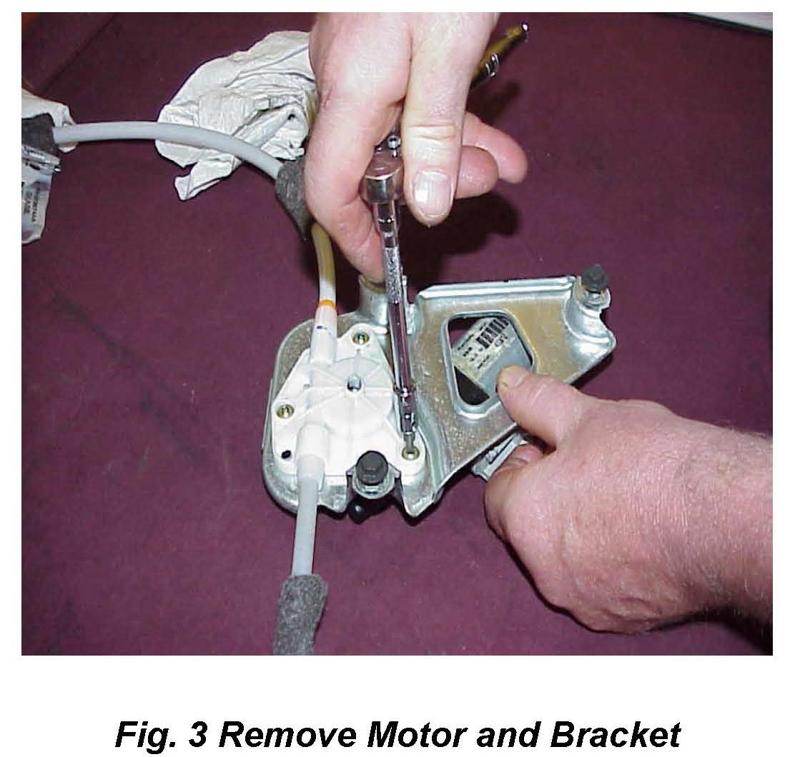 7. Remove the three # 20 Torx screws securing the motor and bracket to the regulator drum. Keep the motor and bracket together for reassembly (Fig 3).