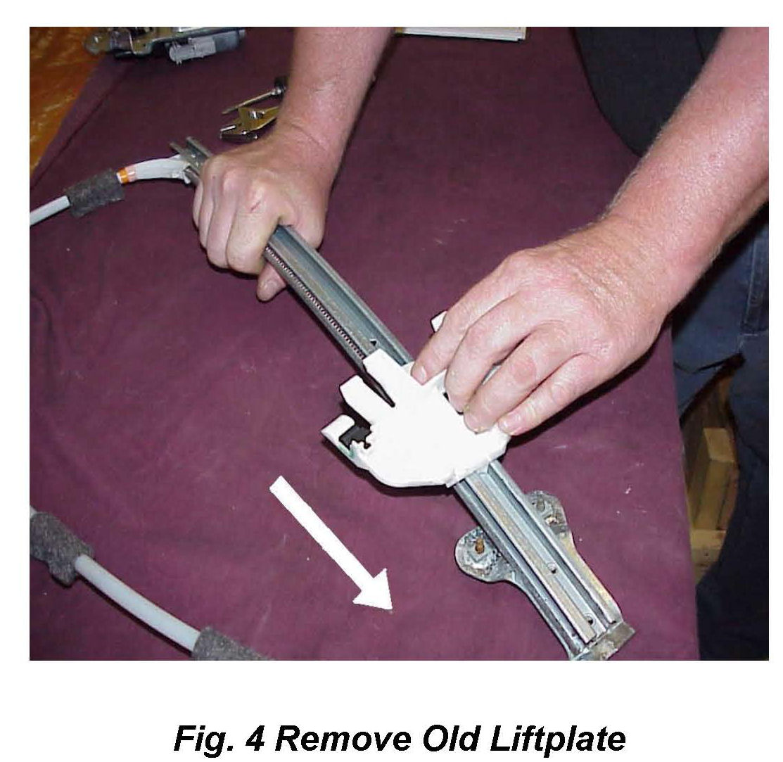 8. Remove the original lift plate and cable from the regulator and discard (Fig 4).