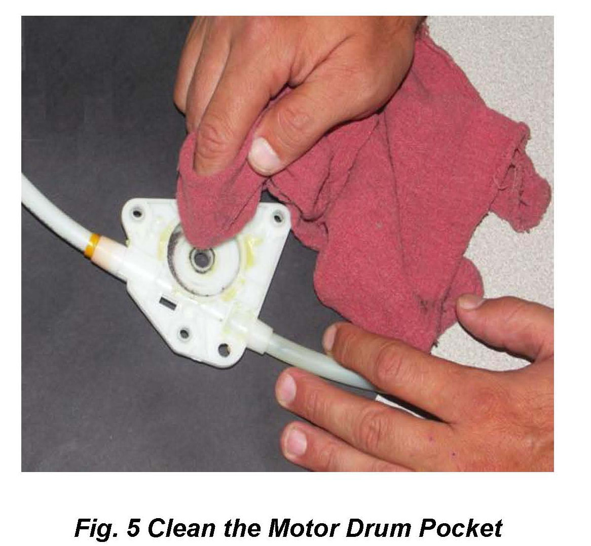 9. Clean the old grease, chips and debris in the Motor Drum Pocket and in the Rail cable groove with a shop rag (Fig 5).