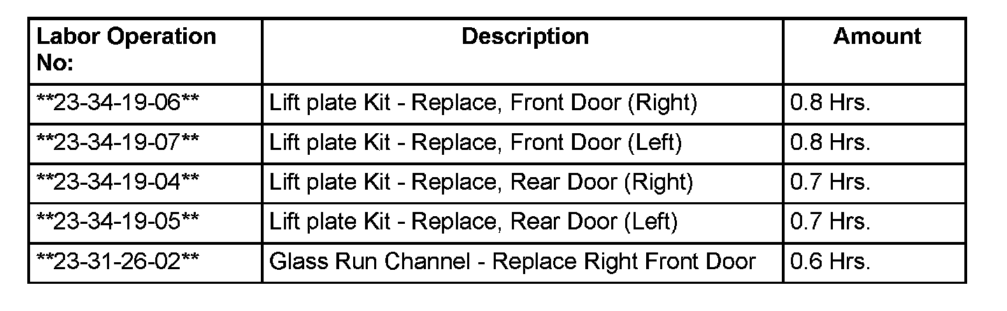 3. Following the procedures in DealerCONNECT > TechCONNECT under: Service Info > 23 - Body > Door > Regulator, Window, remove the window regulator from the affected door(s).