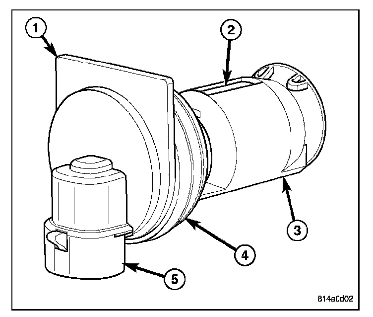 The washer fluid level switch is a single pole, single throw reed-type switch mounted just above the sump area near the bottom of the washer reservoir. Only the molded plastic switch mounting flange (1) and the integral connector receptacle (5) are visible when the switch is installed in the reservoir. A short nipple formation (4) extends from the inner surface of the switch mounting flange, and a barb on the nipple near the switch mounting flange is pressed through a rubber grommet seal installed in the mounting hole of the reservoir.
