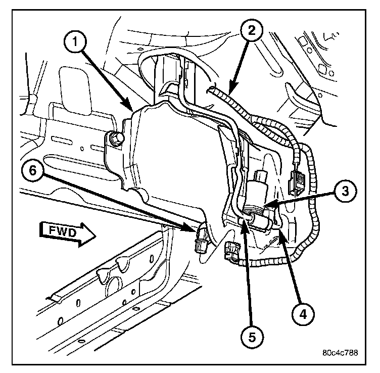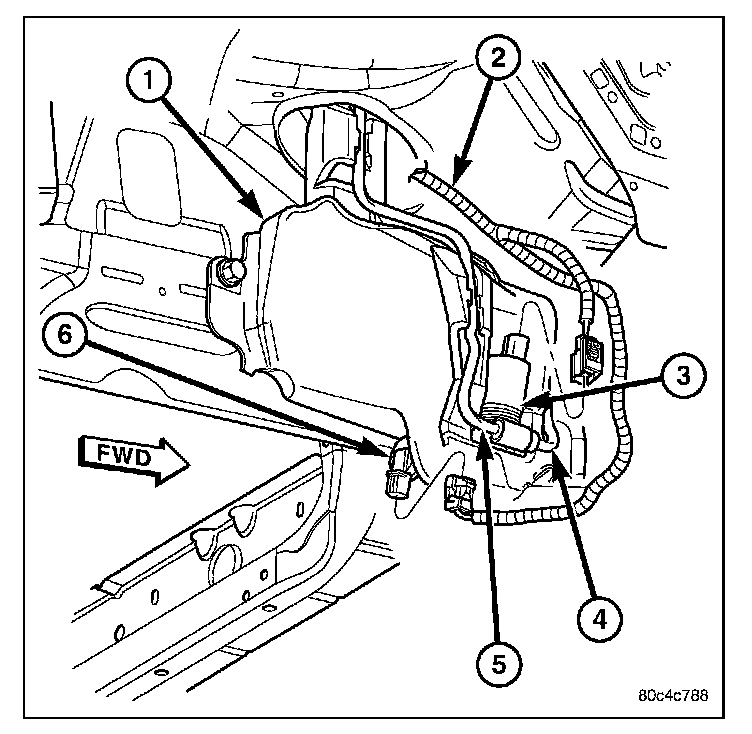8. Disconnect the headlamp and dash wire harness (2) connector from the washer pump/motor unit connector receptacle on the top of the motor housing.