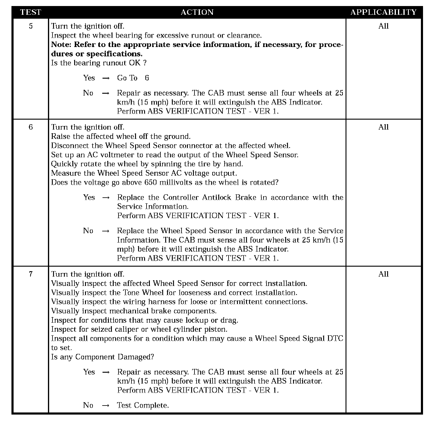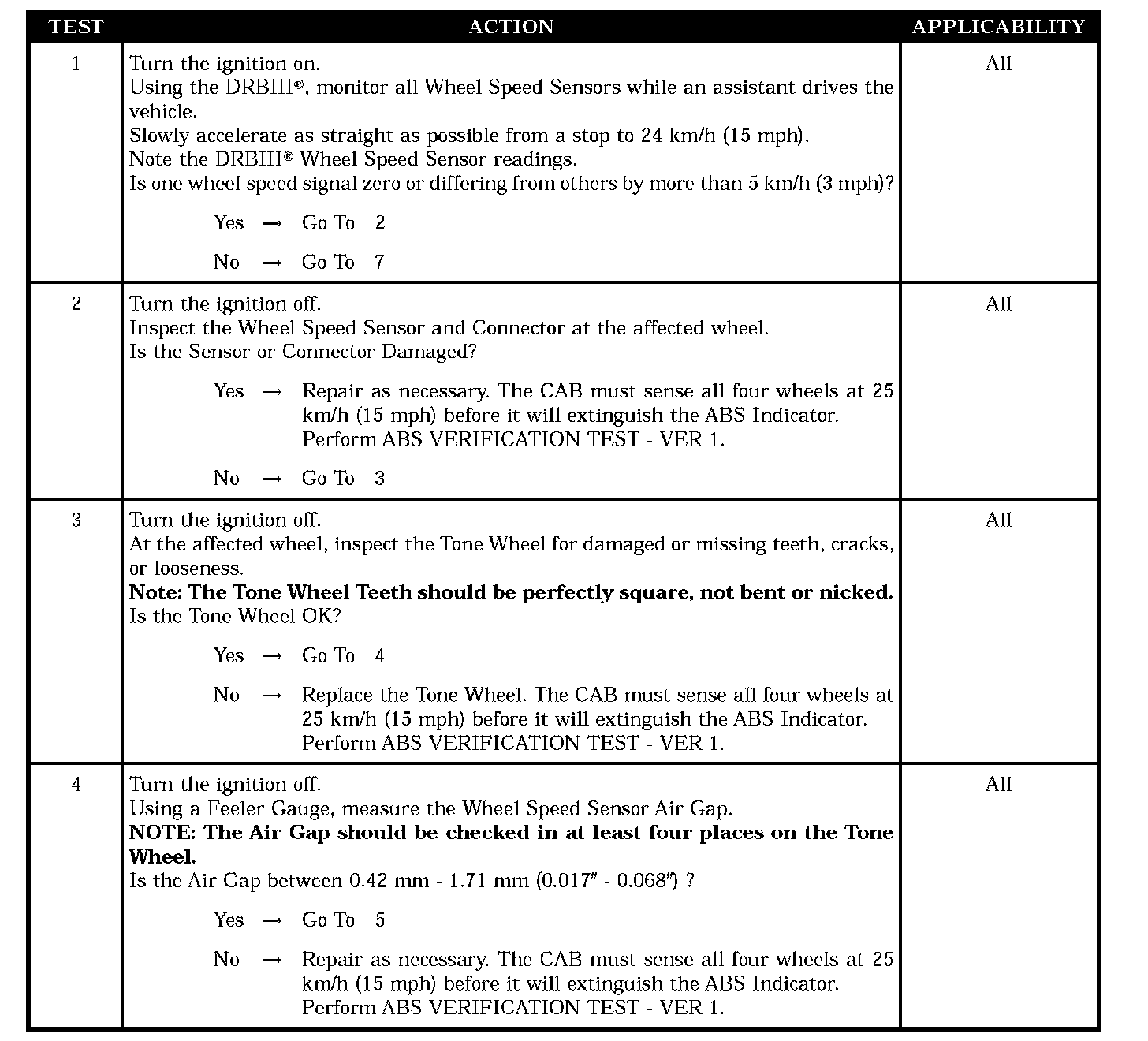 If, during an ABS stop, the CAB commands any valve solenoid on for an extended length of time, and does not see a corresponding wheel speed change, the Diagnostic Trouble Code (DTC) is set. The DTC can also set if the signal is missing or erratic.