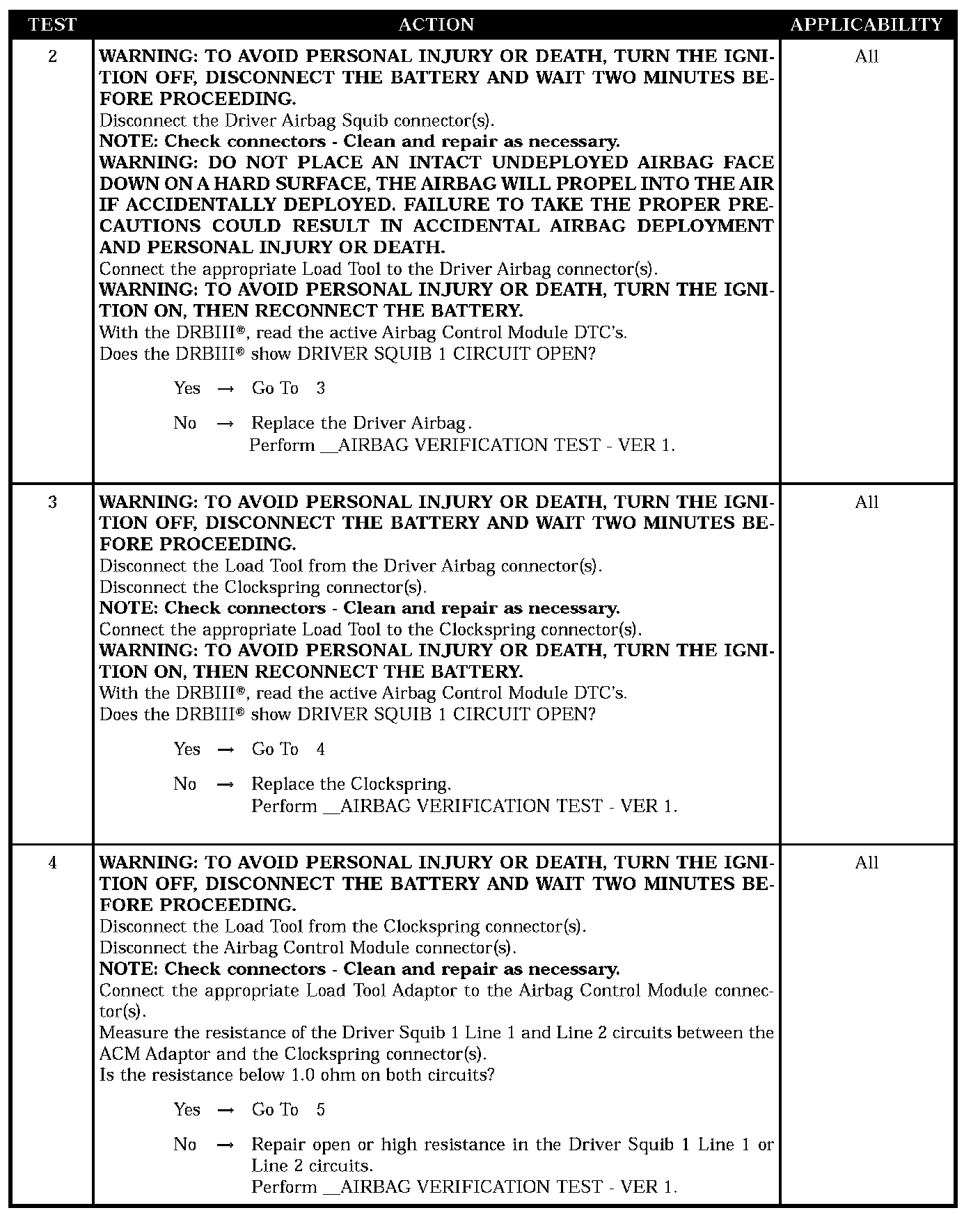 With the ignition on, the ACM monitors the resistance of the Driver Squib 1 circuits.
