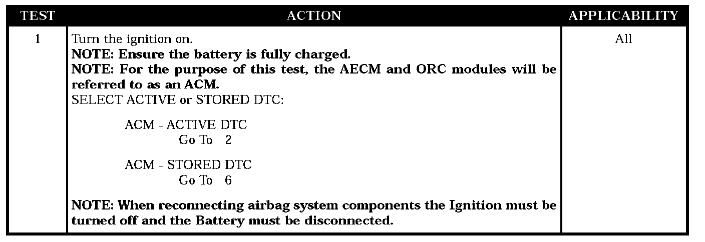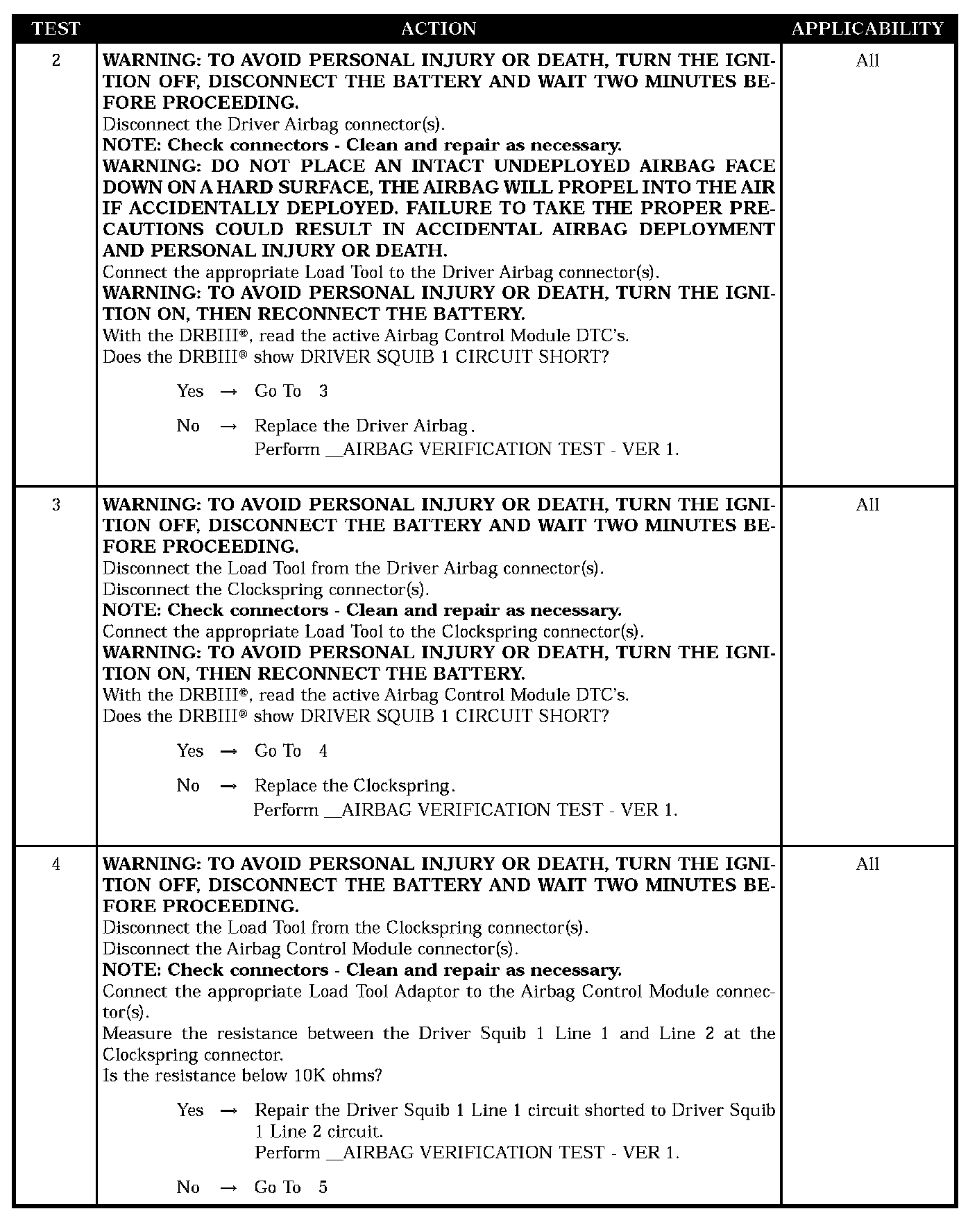 With the ignition on, the ACM monitors the resistance of the Driver Squib 1 circuits.