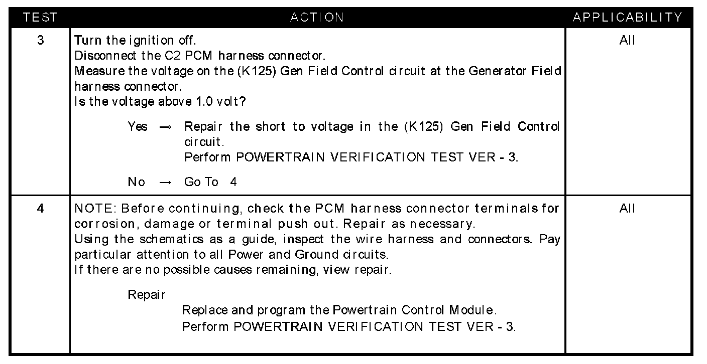 The battery sensed voltage is 1 volt above the charging goal for 13.47 seconds. The PCM senses the battery voltage turns off the field driver and senses the battery voltage again. If the voltages are the same, the code is set.
