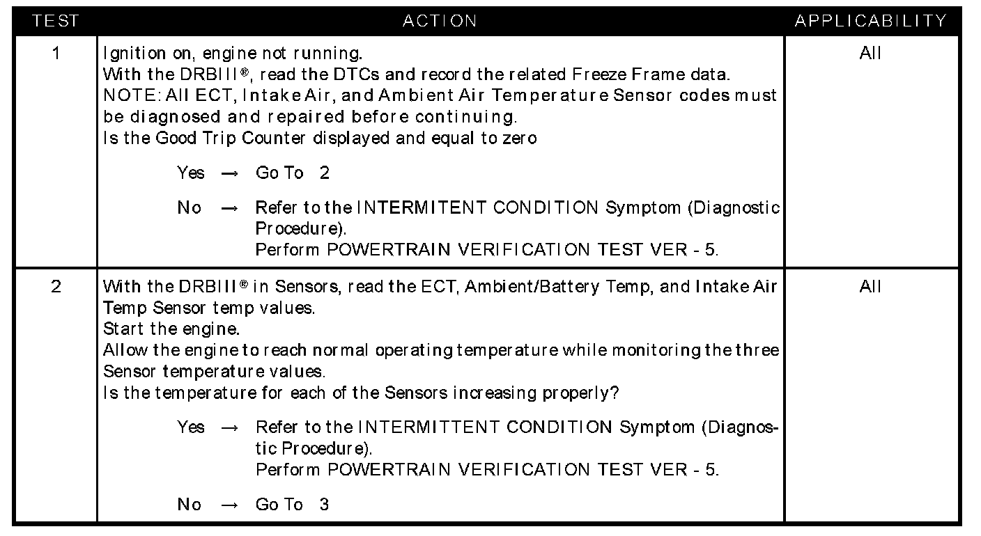 The PCM compares the outputs of the ECT, IAT, and Ambient Temp sensors. If one sensor does not corralate with the other two sensors the fault is set.