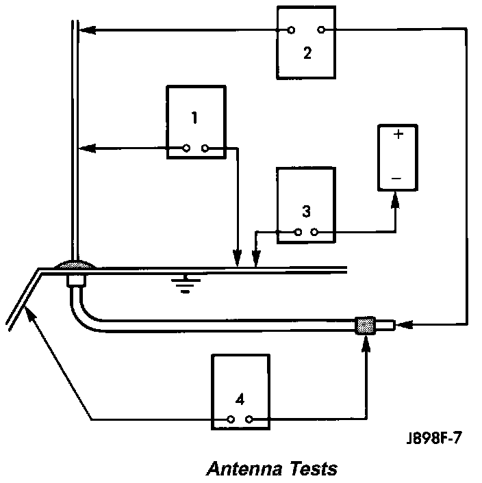 - Test 4 - Body ground to coaxial shield test. The ohmmeter test lead connections for each test are shown in Antenna Tests.