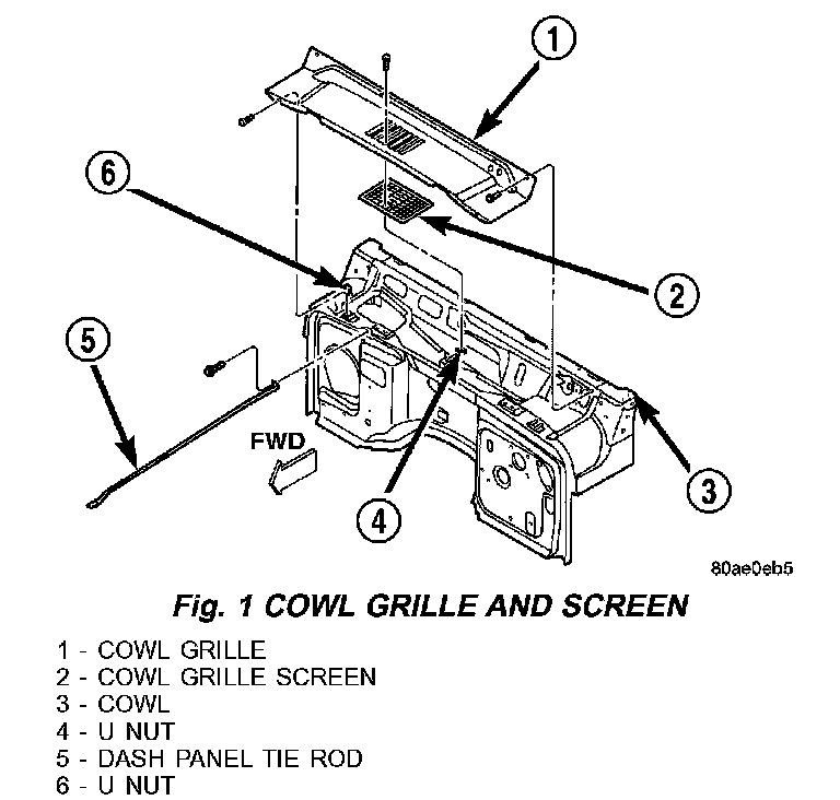 3. Open the hood and remove the screws that attach the cowl grille and screen to the cowl (Fig. 1).
