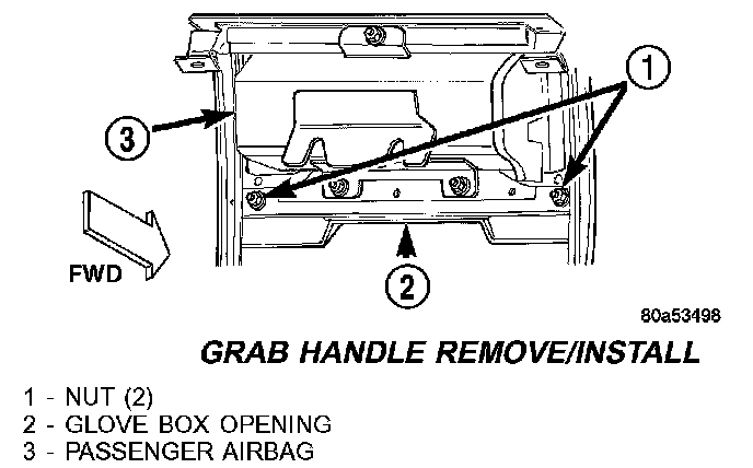 GRAB HANDLEWARNING: ON VEHICLES EQUIPPED WITH AIRBAGS, DISABLE THE AIRBAG SYSTEM BEFORE ATTEMPTING ANY STEERING WHEEL, STEERING COLUMN, OR INSTRUMENT PANEL COMPONENT DIAGNOSIS OR SERVICE. DISCONNECT AND ISOLATE THE BATTERY NEGATIVE (GROUND) CABLE, THEN WAIT TWO MINUTES FOR THE AIRBAG SYSTEM CAPACITOR TO DISCHARGE BEFORE PERFORMING FURTHER DIAGNOSIS OR SERVICE. THIS IS THE ONLY SURE WAY TO DISABLE THE AIRBAG SYSTEM. FAILURE TO TAKE THE PROPER PRECAUTIONS COULD RESULT IN ACCIDENTAL AIRBAG DEPLOYMENT AND POSSIBLE PERSONAL INJURY.