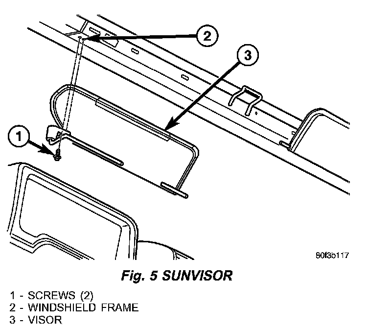 1. Remove the screws that attach the sunvisor arm support brackets to the windshield frame (Fig. 5).