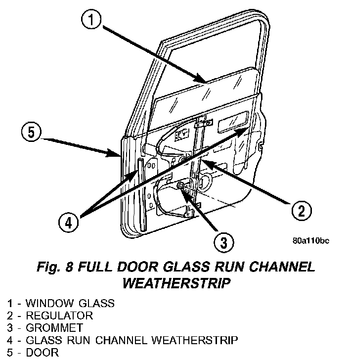 4. Grasp the glass run channel weatherstrip in the door (Fig. 8) and pull from the channel.