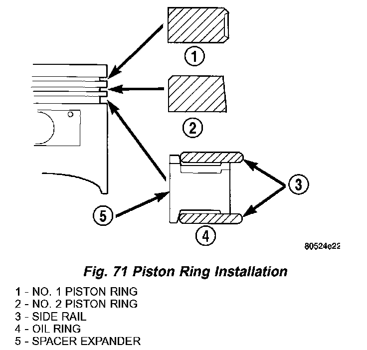 PISTON RINGS - INSTALLATION1. Install rings with manufacturers I.D. mark facing up, to the top of the piston (Fig. 71).