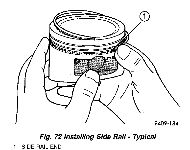 2. Install the side rail by placing one end between the piston ring groove and the expander. Hold end firmly and press down the portion to be installed until side rail is in position. Do not use a piston ring expander (Fig. 72).