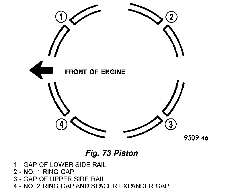 5. Position piston ring end gaps as shown in (Fig. 73).