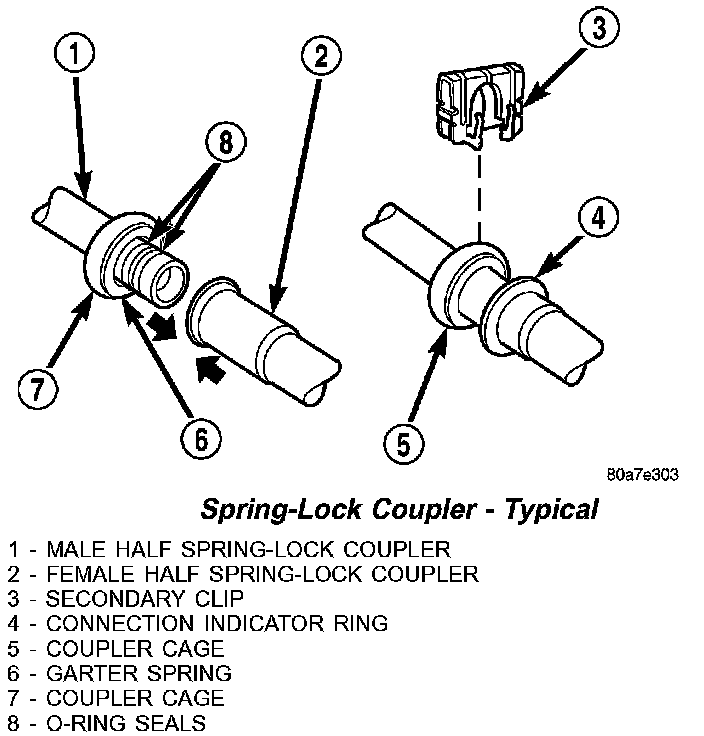 Spring-lock type refrigerant line couplers are used to connect the A/C liquid line to the A/C evaporator and, on RHD models the front section of the liquid line to the rear section of the liquid line. Secondary retaining clips are installed over the connected couplers for added protection.