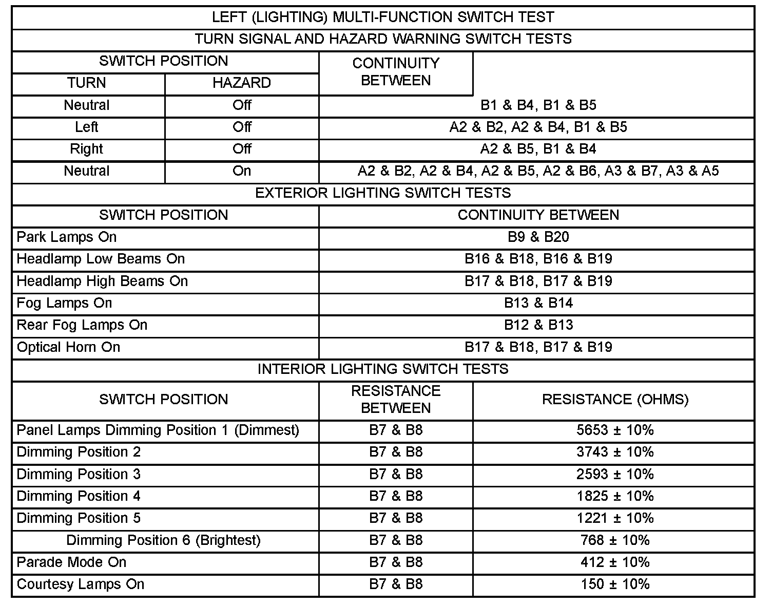 4. Using an ohmmeter, perform the continuity and resistance tests at the terminals in the left multi-function switch connector receptacles as shown in the Left Multi-Function Switch Test table. Refer to and for connector terminal and cavity identification.