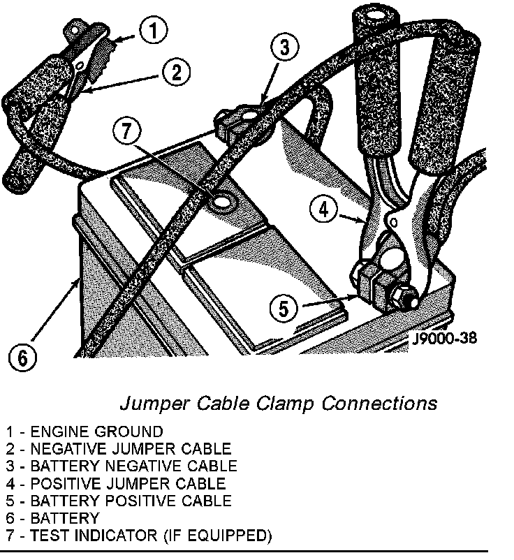6. Allow battery in disabled vehicle to charge to at least 12.4 volts (75% charge) before attempting to start engine. If engine does not start within 15 seconds, stop cranking engine and allow starter to cool (15 min.), before cranking again.