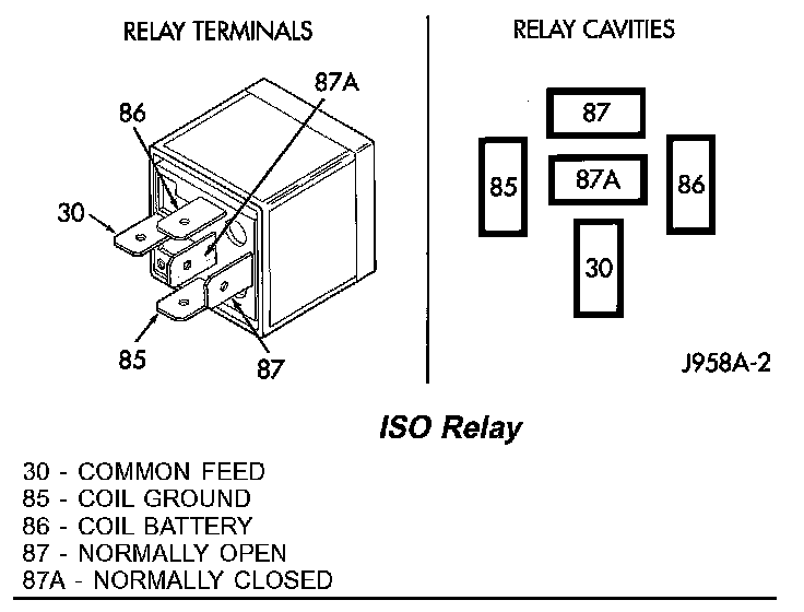 The ISO relay consists of an electromagnetic coil, a resistor and three (two fixed and one movable) electrical contacts. The movable (common feed) relay contact is held against one of the fixed contacts (normally closed) by spring pressure. When the electromagnetic coil is energized, it draws the movable contact away from the normally closed fixed contact, and holds it against the other (normally open) fixed contact.