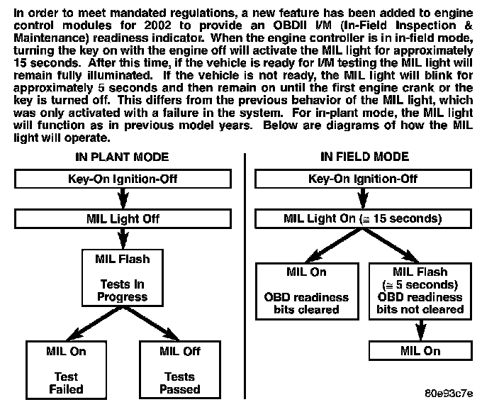 The On Board Diagnostics have evolved to the second Generation of Diagnostics referred to as OBDII. These OBDII Diagnostics control the functions necessary to meet the requirements of California OBDII and Federal OBD regulations. These requirements specify the inclusion of a Malfunction Indicator Light (MIL) located on the instrument panel for all 1994 and subsequent model-year passenger cars, light duty trucks, and medium-duty vehicles. The purpose of the MIL is to inform the vehicle operator in the event of the malfunction of any emission system or component failures that can affect emissions and which provide input to, or receive output from, the PCM.