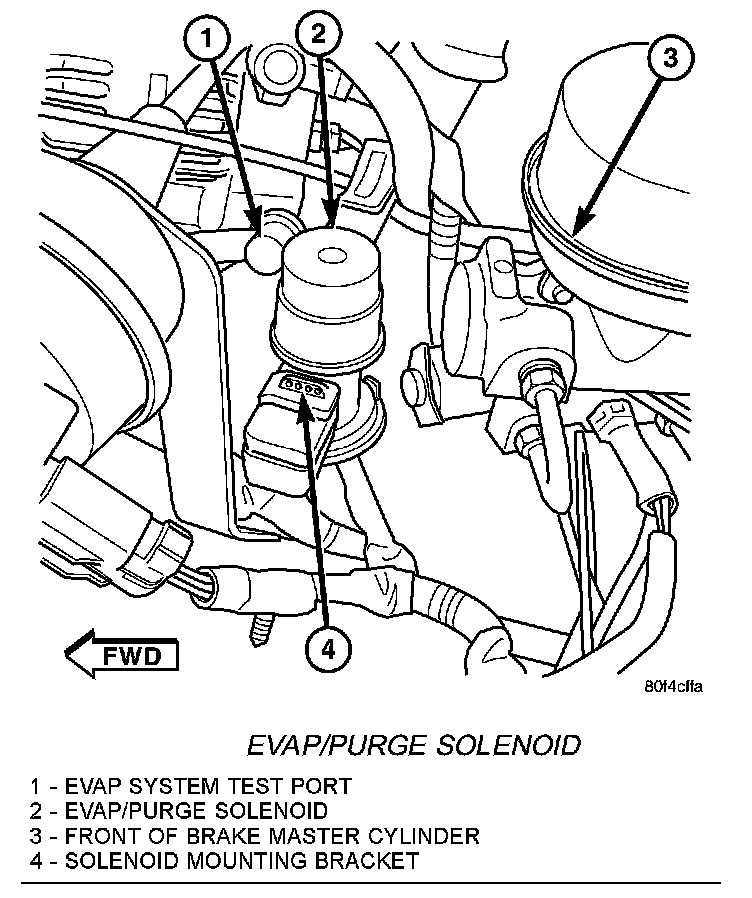 The EVAP System Test Port is located near the EVAP/Purge Solenoid.