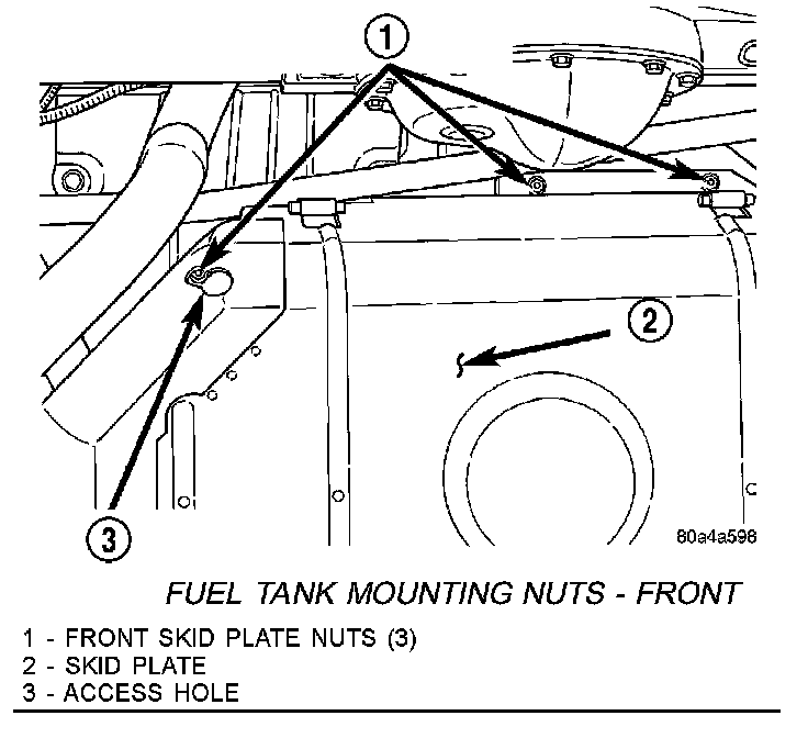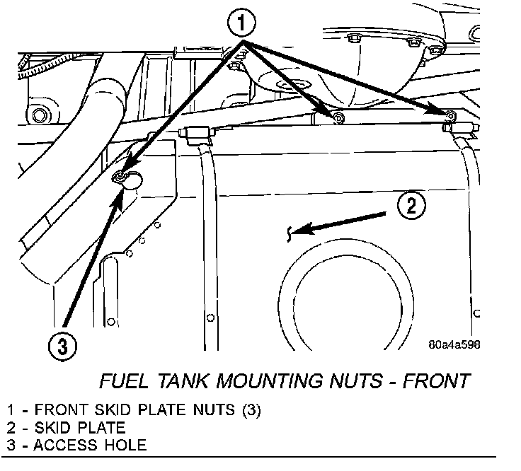 18. Remove three skid plate-to-body nuts (1) at front of tank. Remove one of the nuts through access hole (3) on skid plate.